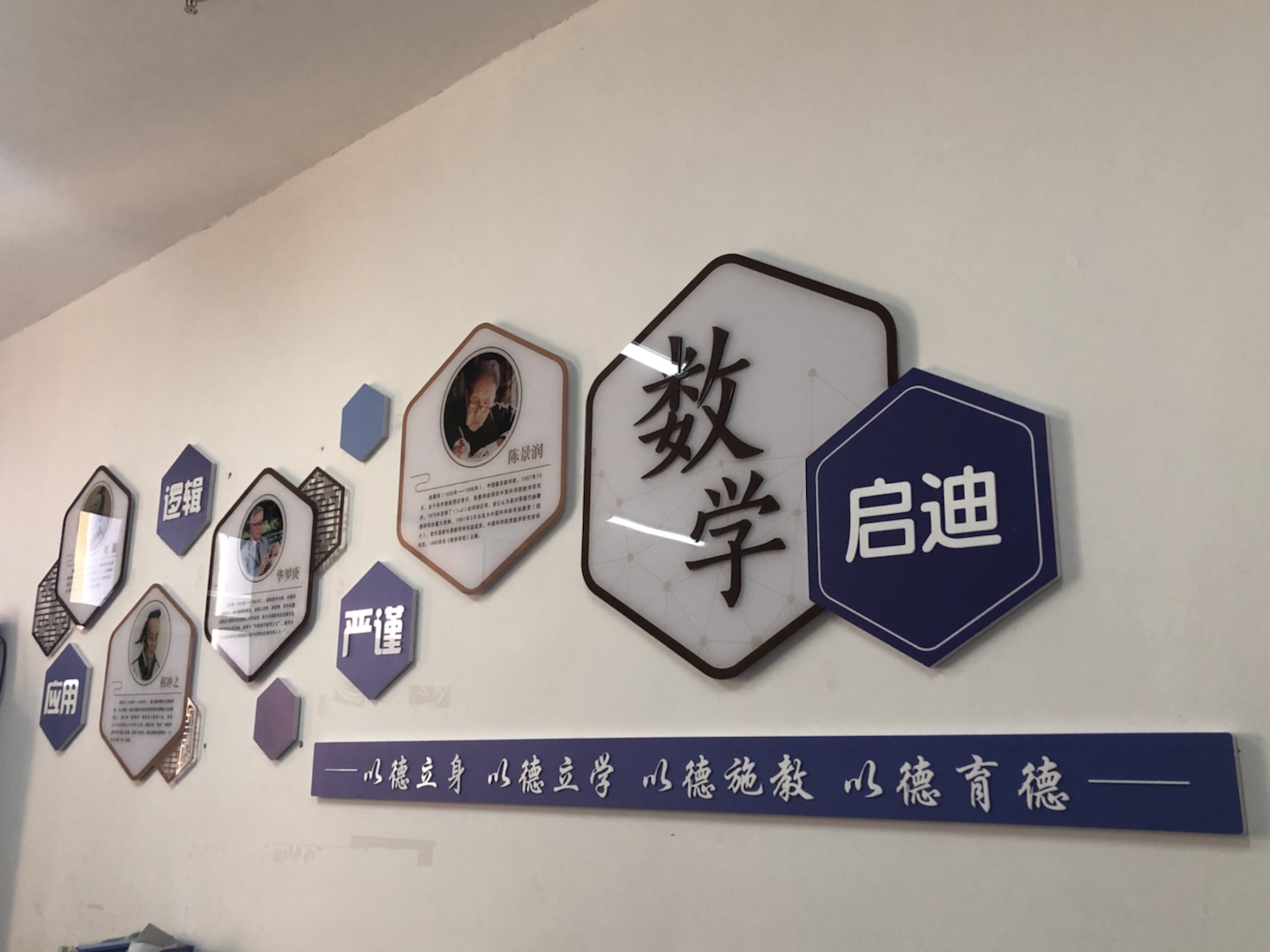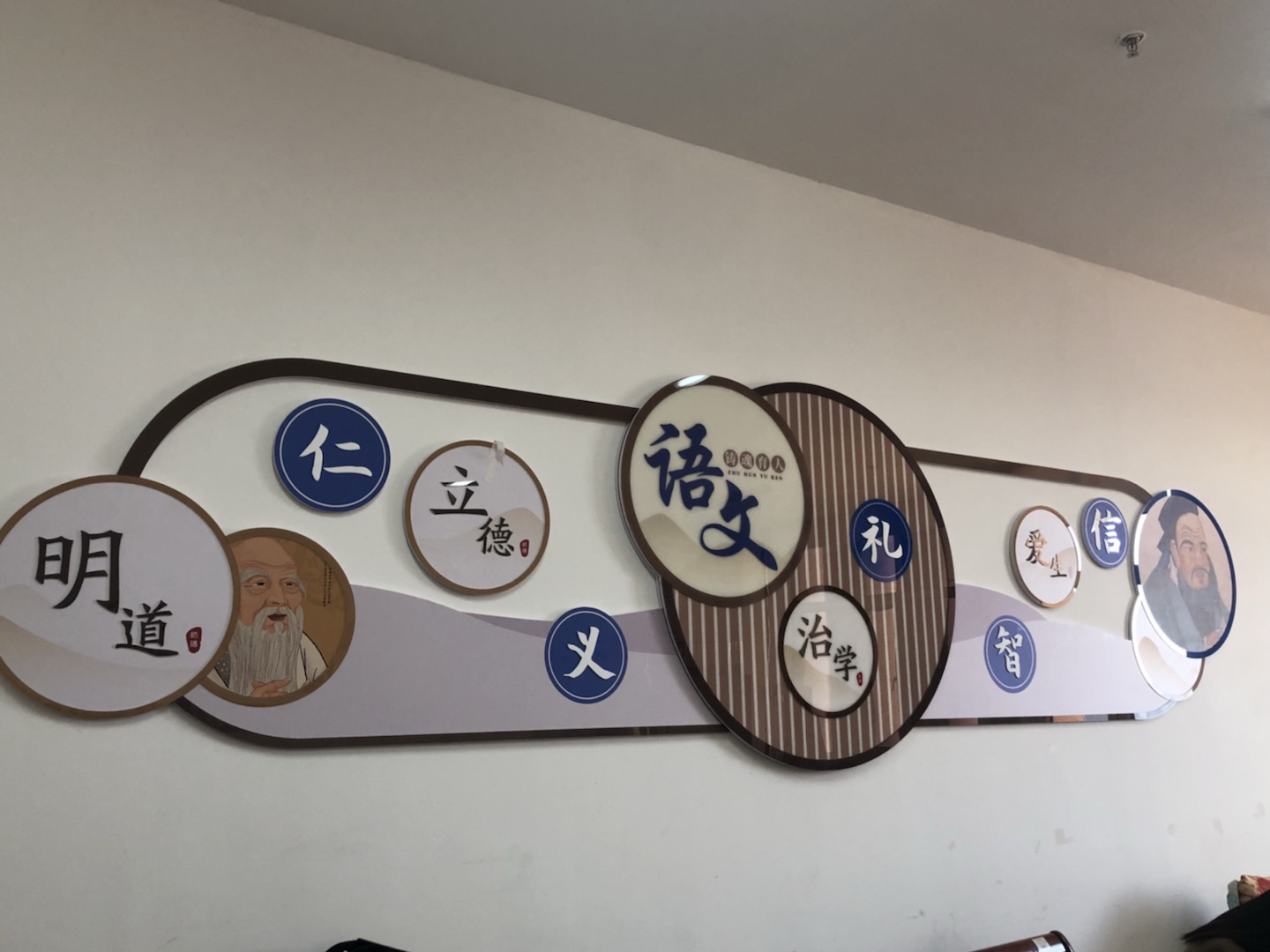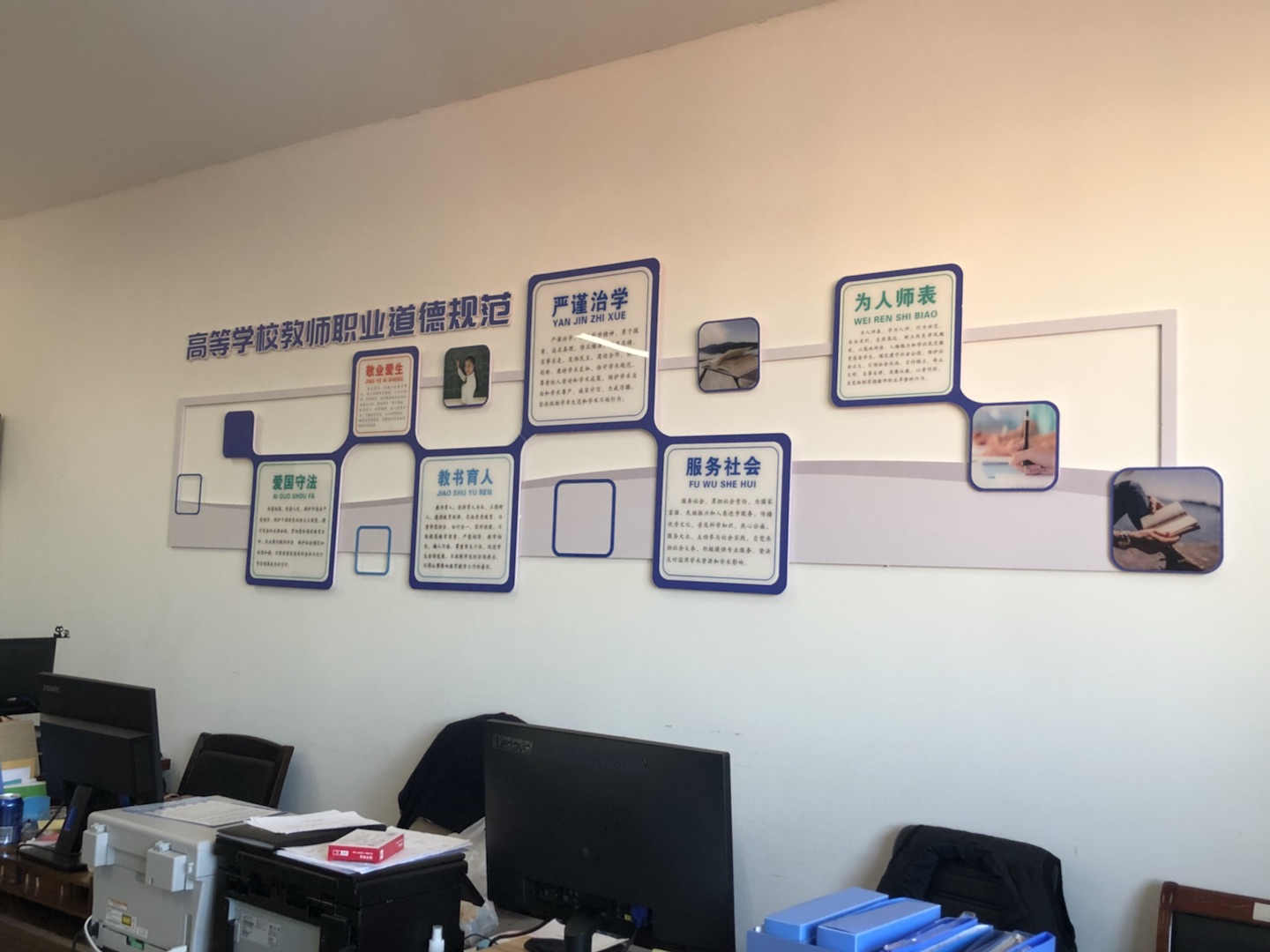 基础教研部通过严格履行招投标程序,在设计方案中,充分挖掘基础学科育人元素,将文化建设作为社会主义核心价值观落小落细落实的重要载体,结合师德师风精神内涵和学科文化底蕴,在设计理念上,将“仁义礼智信”“明道、立德、治学、爱生”等中国优秀传统文化教育元素与“铸牢中华民族共同体意识”“做四有好老师”“以德立身、以德立学、以德施教、以德育德”等内容融入文化建设中;将“新时代高校教师职业行为十项准则”“高等学校教师职业道德规范”等规章制度上墙,有效丰富了各基础学科办公室文化内涵,形成了有意蕴,有主题,有温度、有美感、有获得感的浓厚氛围,引导全体教师安心从教、热心从教、舒心从教、静心从教,充分发挥了环境育人的浸润作用,激发了全体教师的凝聚力、向心力,潜移默化引导全体基础教师牢固树立中国特色社会主义理想信念,带头践行社会主义核心价值观,自觉增强立德树人、教书育人的荣誉感和责任感,学为人师,行为世范,做学生健康成长的指导者和引路人。