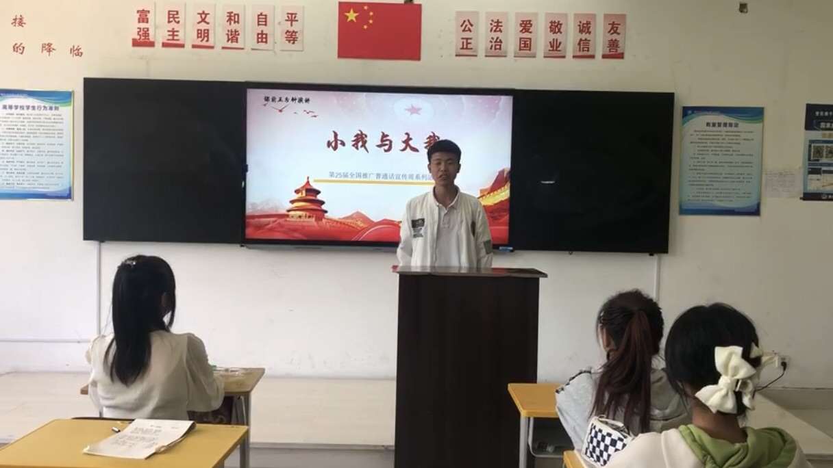 一是丰富教育载体及内容,在大专语文“开学第一课”集体备课时加入“推普进课堂”环节,将“使学生了解讲好普通话的重要性,铸牢中华民族共同体意识。”编入课程思政教学目标。设计了“推普进课堂”教学环节,组织学生观看了第25届普通话宣传周宣传片,使学生了解讲好普通话的重要性,进一步提高推广普通话参与意识,营造良好的语言文字环境。