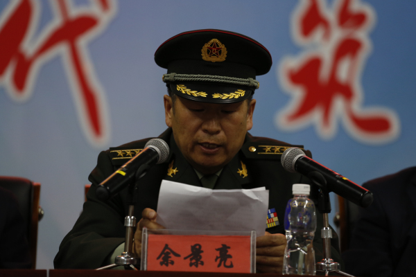 军分区副司令员余景亮做动员讲话,并为我院学生发放征兵宣传册。